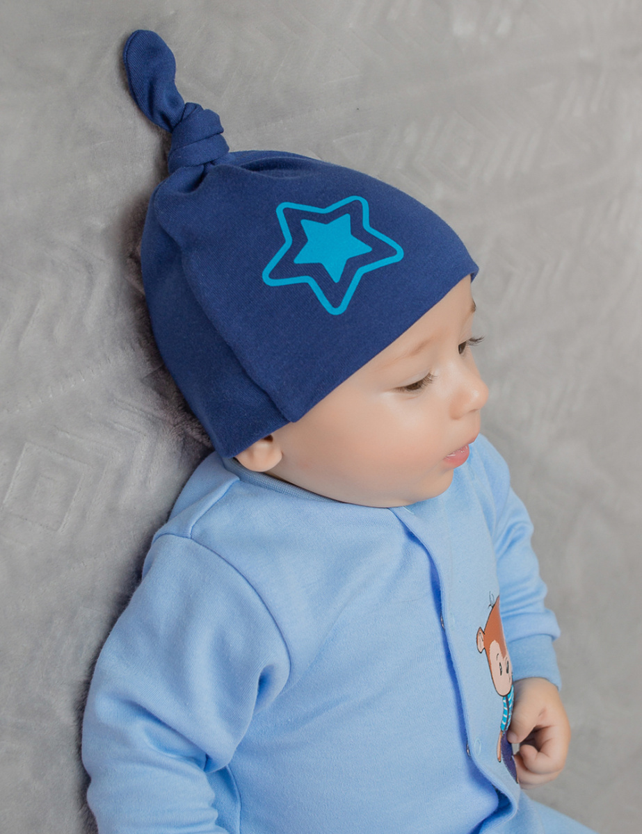 Забавная модель с узелком на макушке дополнена регулируемым отворотом. Стильный принт, нанесённый методом шелкографии на ткани. Идеально подойдет для ежедневного гардероба малышей, на выписку, в роддом, на прогулку.